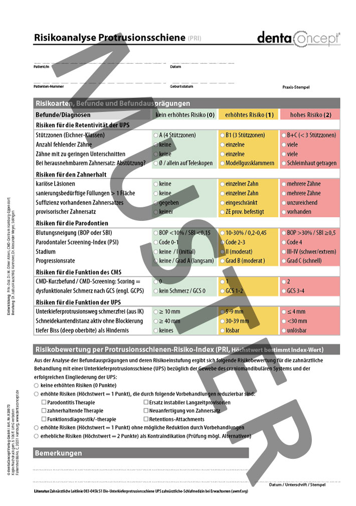 Die Behandlung mit einer Unterkieferprotrusionsschiene (UPS) erfolgt bei Schnarchen und/oder Schlafapnoe. Bei Schlafapnoe ist vorab eine schlafmedizinische Untersuchung und später eine Erfolgskontrolle erforderlich. Um das Risiko einzuschätzen, kombiniert der Fragebogen Tagesschläfrigkeit & Schlafapnoe zwei wissenschaftlich abgesicherte Tests. Diese sind für Patienten leicht auszufüllen, und die spezielle Gestaltung des Bogens vereinfacht die Auswertung in der Praxis. Eine kurze Anleitung befindet sich auf dem Deckblatt.
